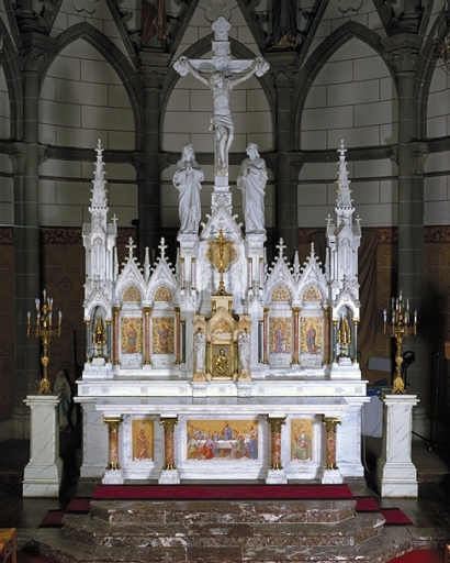 Ensemble du maître-autel : autel, retable, tabernacle, gradin, 3 degrés d'autel, 2 consoles,