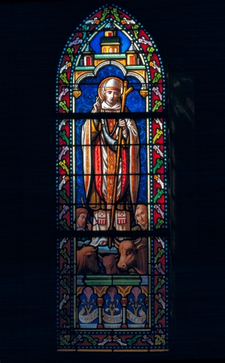 Ensemble des 14 verrières basses de la nef : saints Michel, Camille, Isidore, Coulomb, Méen, Convoyon, Malo, évêque, Cornely, Ange gardien, Baptême du Christ, Christ roi, Notre-Dame de Liège, Notre-Dame de Pontmain,