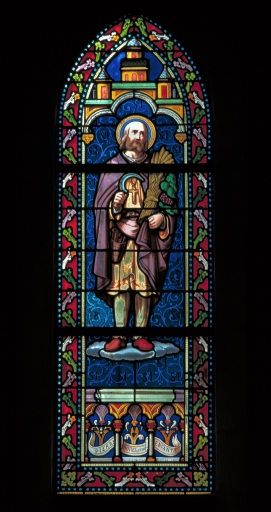 Ensemble des 14 verrières basses de la nef : saints Michel, Camille, Isidore, Coulomb, Méen, Convoyon, Malo, évêque, Cornely, Ange gardien, Baptême du Christ, Christ roi, Notre-Dame de Liège, Notre-Dame de Pontmain,