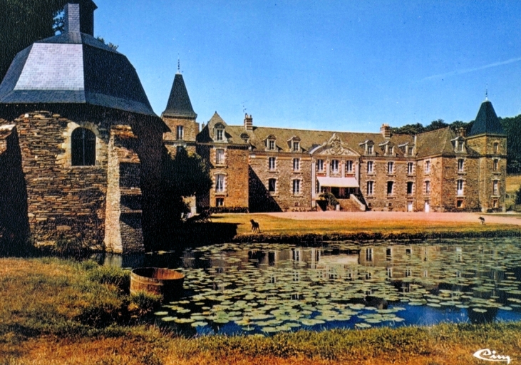 Carte postale des années 1960 présentant la façade sud du château ; au premier plan, les douves et la chapelleImmatriculation