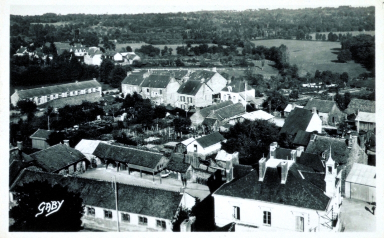 La mairie sur une carte postale au milieu du XXe siècle : vue aérienne nord-ouesImmatriculation