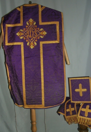 Ornement violet 1 : chasuble, étole, manipule, voile de calice, bourse de corporal,