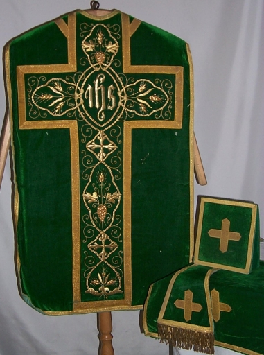 Ornement vert 2 : chasuble, étole, bourse de corporal, voile de calice,
