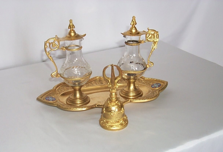 2 burettes & leur plateau, sonnette d'autel dans leur boîte,