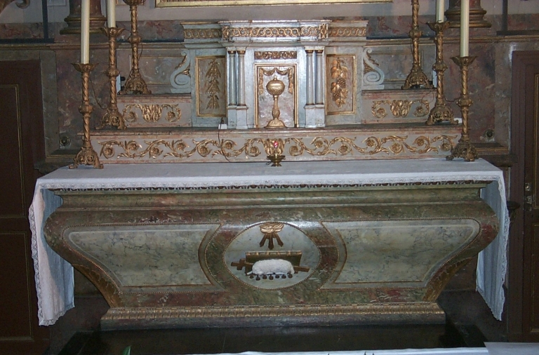 Ensemble du maître-autel : autel, 2 gradins, tabernacle, retable, 3 degrés d'autel,