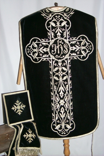 Ornement noir 1 : chasuble, étole, manipule, bourse de corporal,
