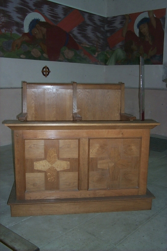 Fauteuil de célébrant, 9 tabourets d'église, 2x2 stalles,