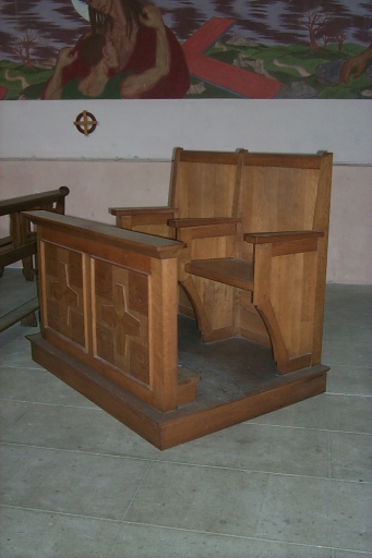 Fauteuil de célébrant, 9 tabourets d'église, 2x2 stalles,