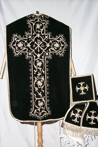 Ornement noir : chasuble, étole, manipule, bourse du corporal,