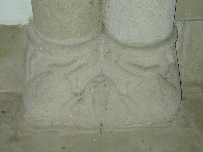 Remploi : chapiteaux jumelés dans le clocher-porche, pilier sud-ouestImmatriculation