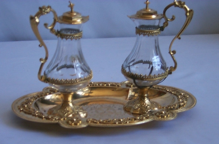 Chapelle : calice, patène, plateau à burettes, 2 burettes, clochette,