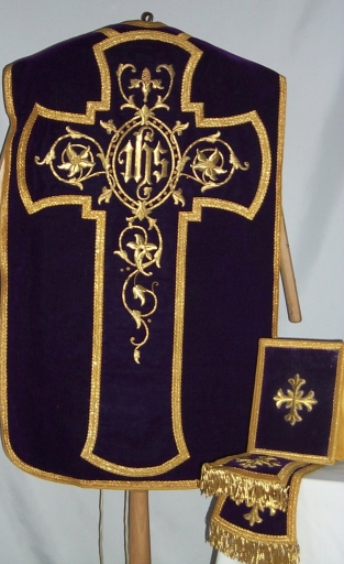 Ornement violet 2 : chasuble, étole, manipule, bourse du corporal,