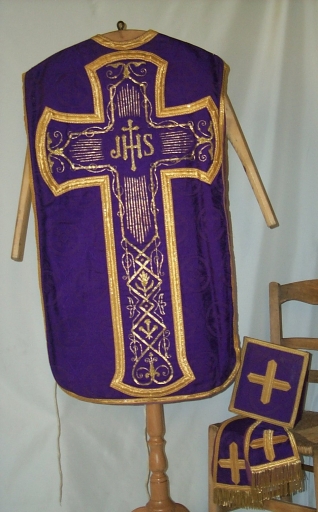 Ornement violet 1 : chasuble, étole, manipule, bourse du corporal,