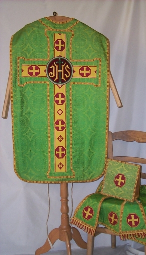 Ornement vert : chasuble, étole, manipule, bourse du corporal, voile du calice,