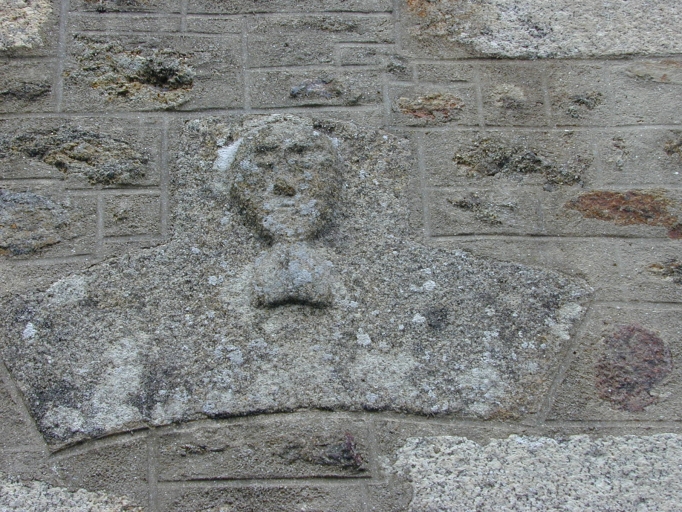 Pierre de remploi sculptée d'une tête enchâssée dans la façade : détailImmatriculation