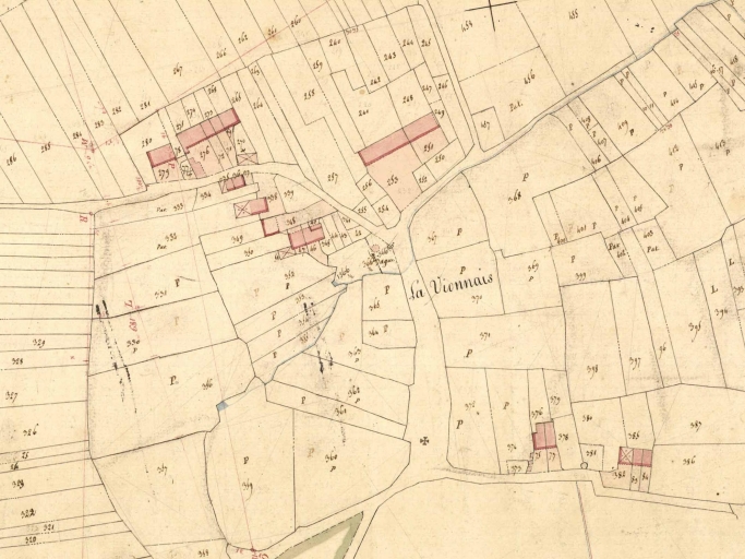 Vue de situation sur le cadastre de 1831 ; alignement en haut à droite sur l'imageImmatriculation