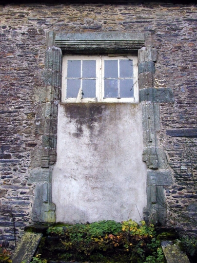 Détail : le logis, façade nord, fenêtre monumentale du 16e siècle transformée en porte-fenêtre au 17e ou 18e siècleImmatriculation