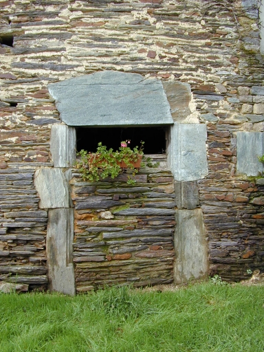 Détail : aile ouest des communs, façade est, éléments de baie ancienne en remploiImmatriculation