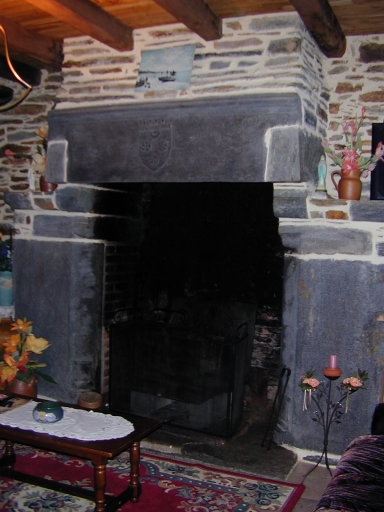 Détail : intérieur, à l'origine située à l'étage, cheminée à piédroits chanfreinés et sculptés portant des armoiries non identifiées, 1490-1530Immatriculation