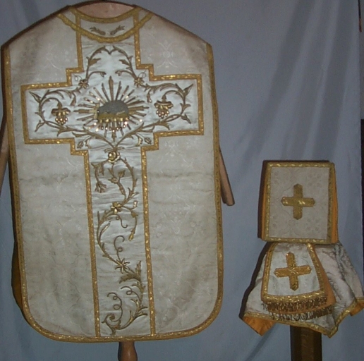 Ornement blanc 7 : chasuble, bourse de corporal, étole, manipule, voile de calice,