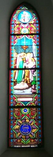 Ensemble des verrières à personnages des baies 0 à 4, de la rose et du tympan : Vierge de Pitié, saint Jean-Baptiste, sainte Philomène, saint Joseph et l'Enfant, saint Stanilas Kostka, Apparition du Sacré-Coeur, anges,