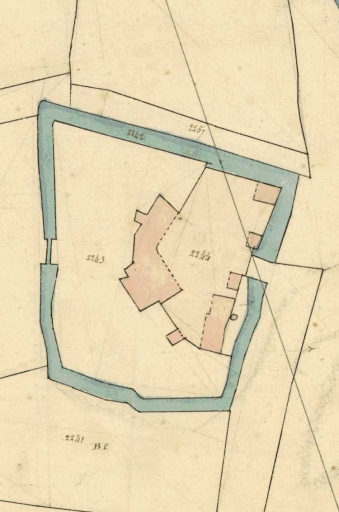 Le manoir et ses dépendances, entourés de douves en eau, sur le cadastre de 1831Immatriculation