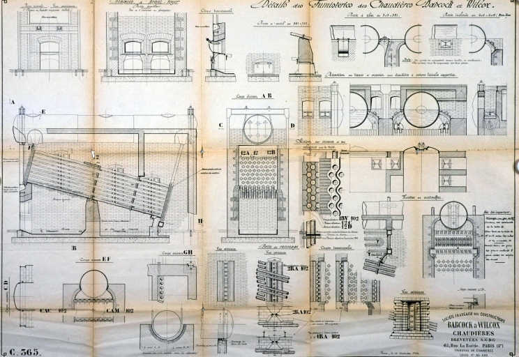 Plan technique, détail des fumisteries des chaudières Babcock et Wilcox.Immatriculation