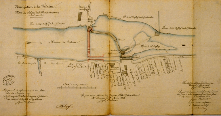 Plan des abords de l'écluse de Macaire (1822). A cette époque, le moulin de Macaire présente, en amont, un éperon. Après sa destruction vers 1835, le moulin est reconstruit sur la rive opposée selon un plan plus traditionnel, rectangulaire.Immatriculation