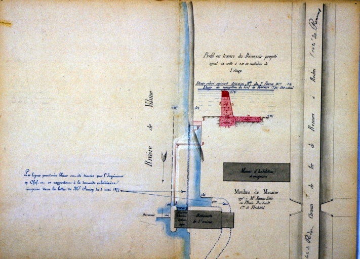 Plan de situation et profil en travers du déversoir projeté (26 avril 1877).Immatriculation