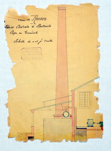 Usine centrale d'électricité, coupe en travers et détail de la cheminée d'usine (1891).Immatriculation