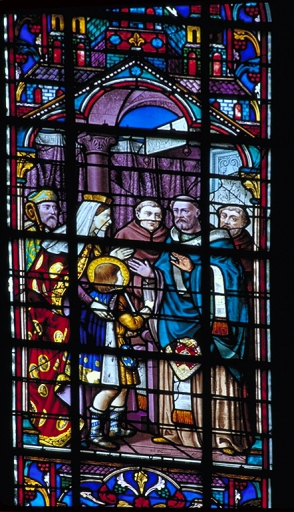 Ensemble des 3 verrières à personnages des baies 200, 201 et 202 : Scènes de la vie de saint Méloir,