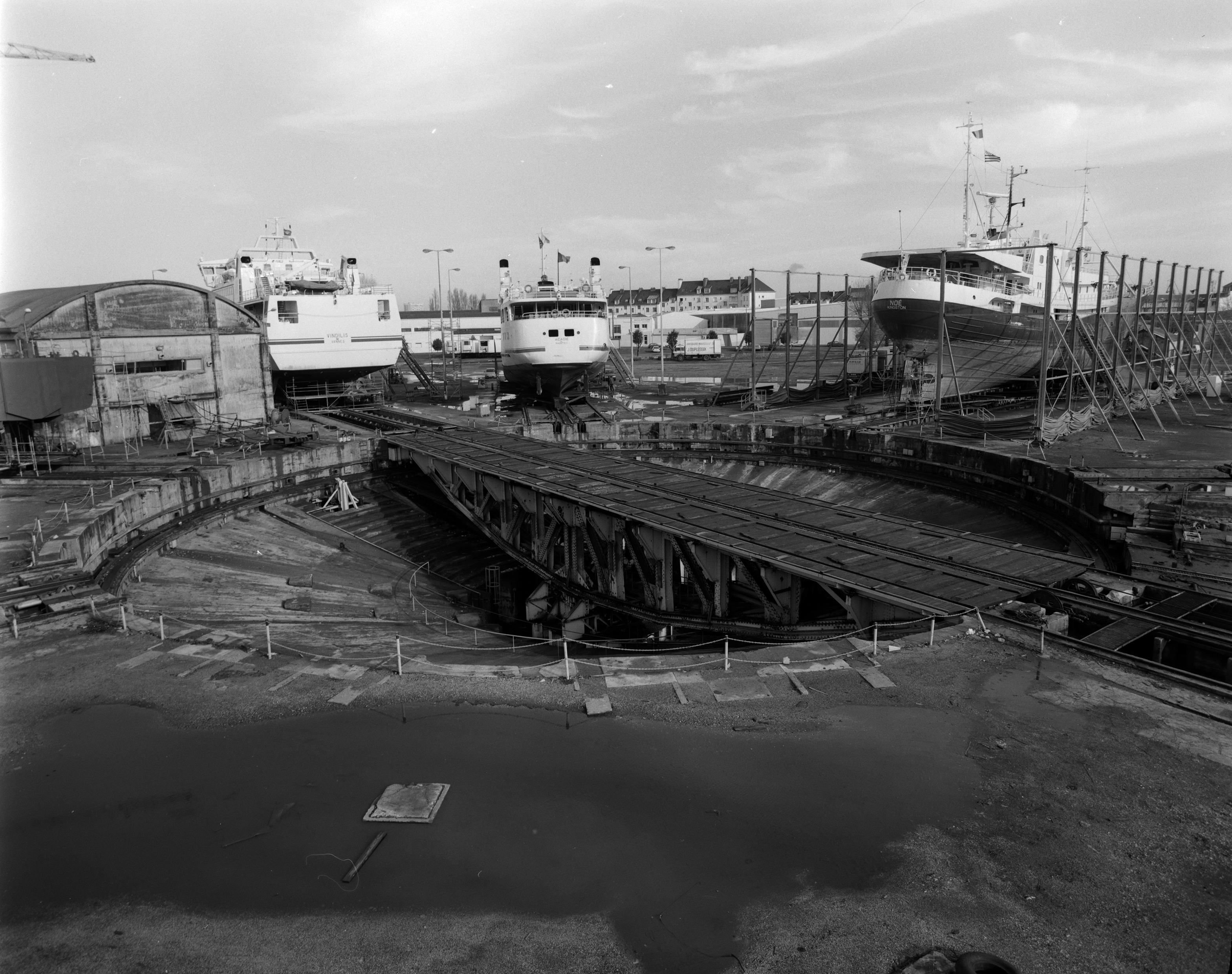Vue du pont basculant et tournant en 2000. A l'arrière, les lignes de réparation navale n° 2, 3 et 4. A gauche, le bâtiment abritant le treuil principal de hissageImmatriculation