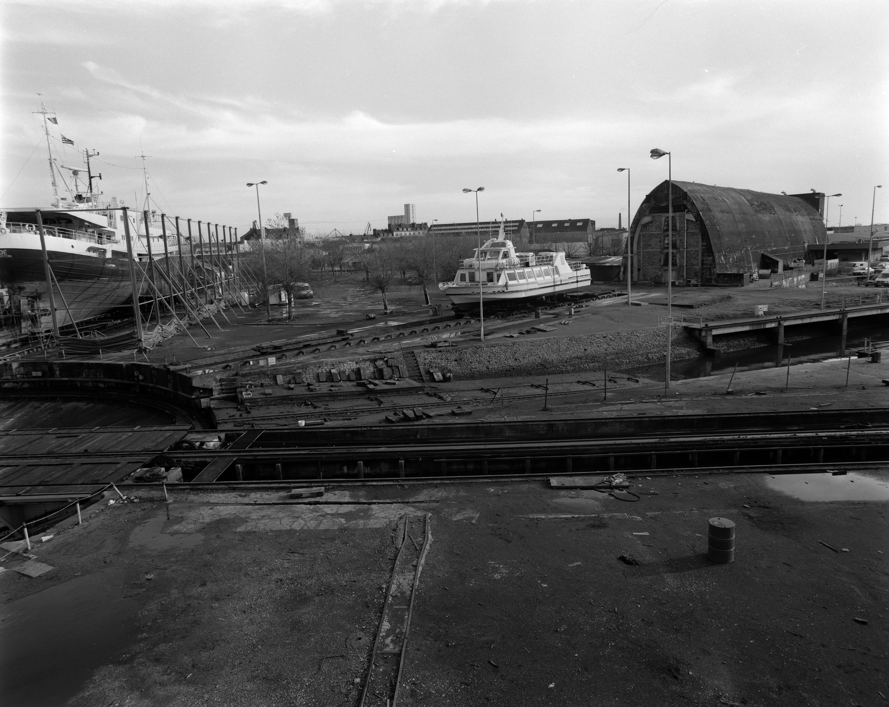 Vue des lignes de réparation navale n° 7 (dom-bunker ouest), n° 1 (dom-bunker est) et n° 2. Au centre, la rampe inclinée ou cale du slipwayImmatriculation