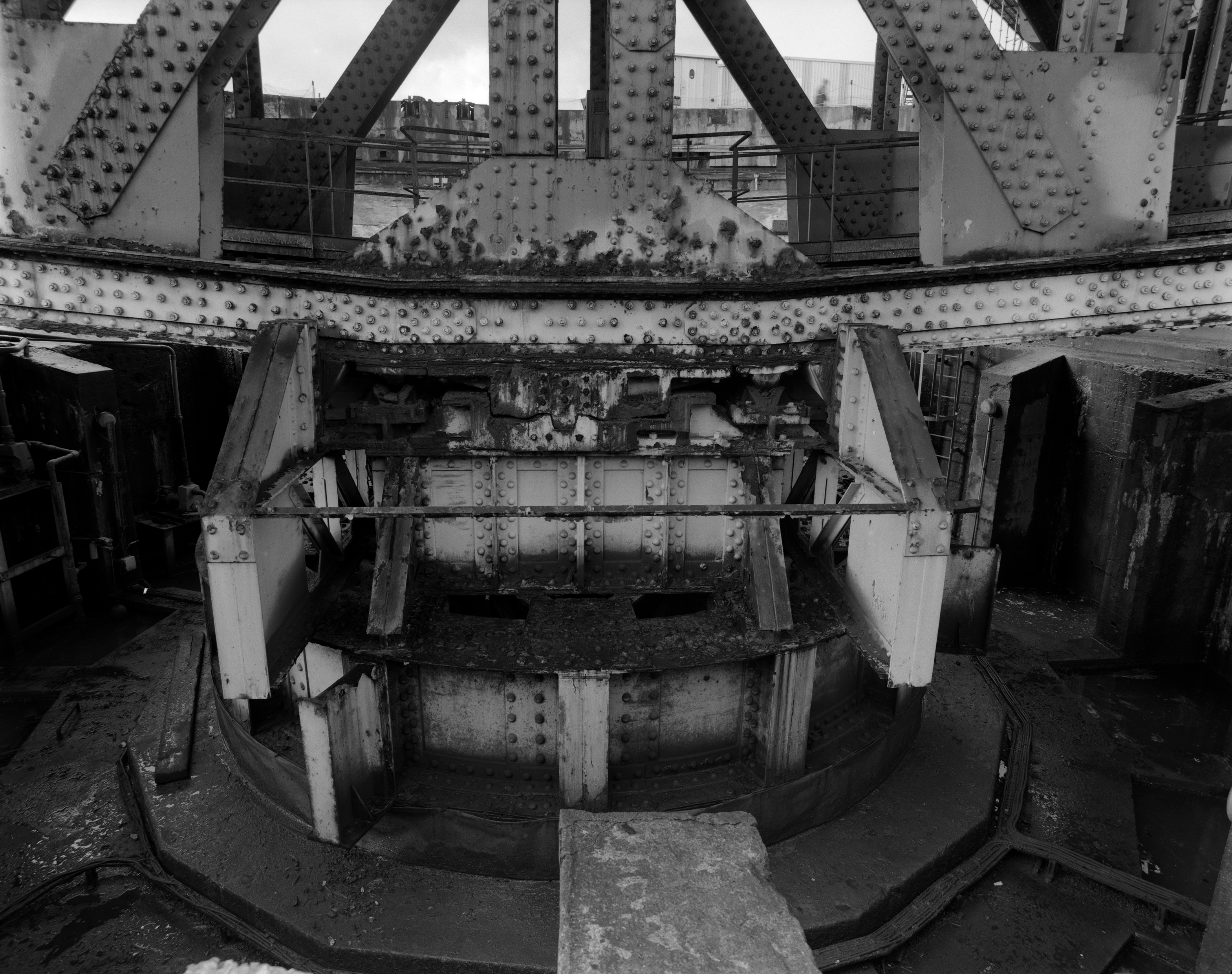 Vue de détail du pont basculant et tournant dans sa fosse bétonné en 2000 : axe central et point de basculeImmatriculation