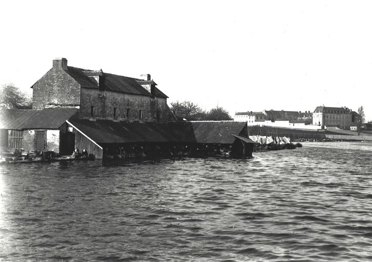 Vue des lavoirs sur l'étang au duc et de l'Hôpital général. Photographie ancienne, vers 1900. Cliché Villard. Fonds Villard, Drac Bretagne, SRI, Rennes.Immatriculation