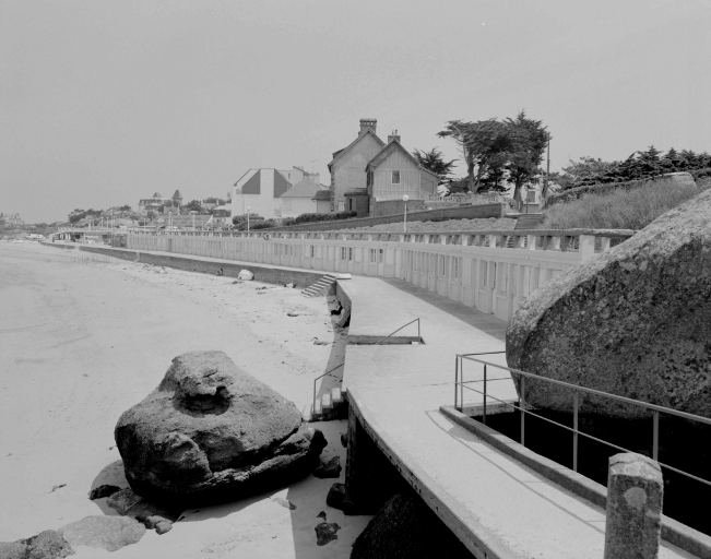 Trégastel : digue et cabines de bains de la plage de Coz-Pors, construites en partie en 1933-1934 par l'architecte lannionnais Jean le Corre, et en partie dans les années 1970 selon le même modèle.Immatriculation
