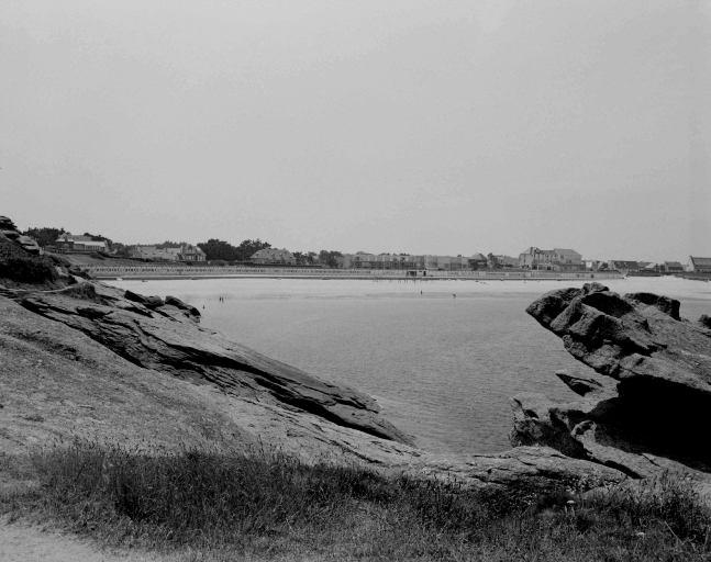 Trégastel : la digue et les cabines de bains de la Grève-Blanche construites par les Ponts et Chaussées vers 1959.Immatriculation