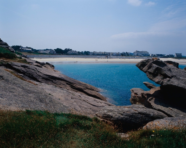 Trégastel : la digue et les cabines de bains de la Grève-Blanche construites par les Ponts et Chaussées vers 1959.Immatriculation
