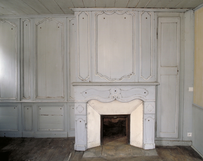 Premier étage, pièce centrale, mur nord, cheminée et lambrisImmatriculation