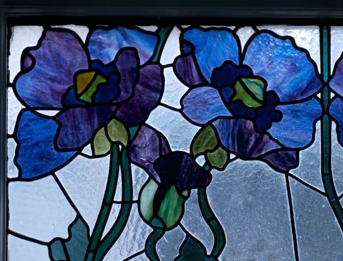 Vitrail de la salle-à-manger, détail.Immatriculation