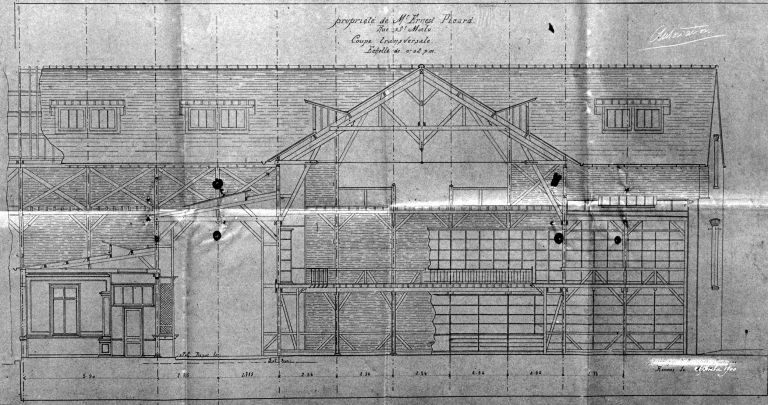 Construction de dépôt pour les gros fers, quincaillerie, magasins et bureaux. Coupe, 1900 (A. C. Rennes)Immatriculation