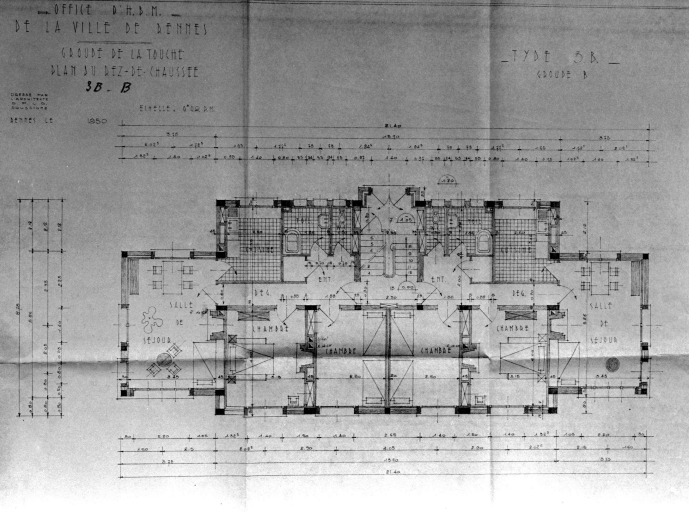 Immeubles de type III, plan du rez-de-chaussée, par Yves Lemoine, 1950 (A. C. Rennes)Immatriculation