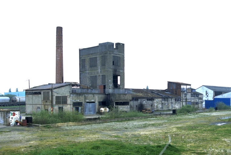 Vue générale nord prise du chemin de fer. Le bâtiment de la colonne de distillation et la cheminée d'usine sont parfaitement perceptibles.Immatriculation