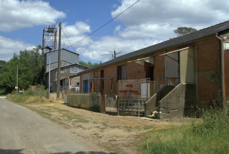 Vue générale sud-ouest : logements d'ouvriers, laverie gravimétrique et chevalement métallique.Immatriculation