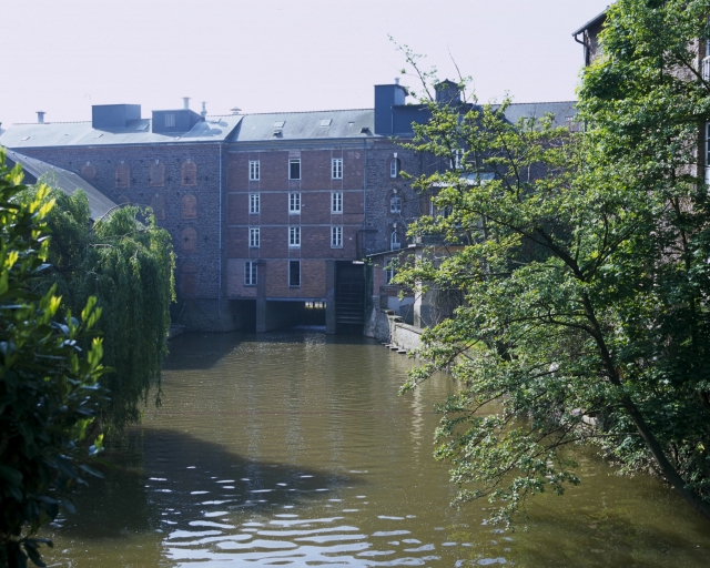 Vue générale nord des Grands Moulins et de la roue hydraulique verticale.Immatriculation