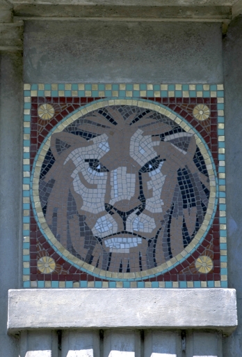 Détail d'une mosaïque ; la tête de lion fait référence à la marque déposée par l'entreprise.Immatriculation