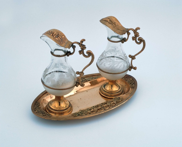 Chapelle et sa boîte : calice, patène, 2 burettes et leur plateau,