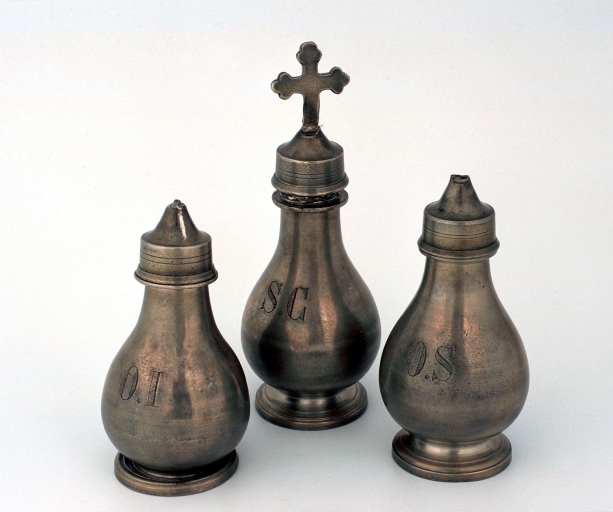 Ensemble de 3 réserves aux saintes huiles avec leur boîte,