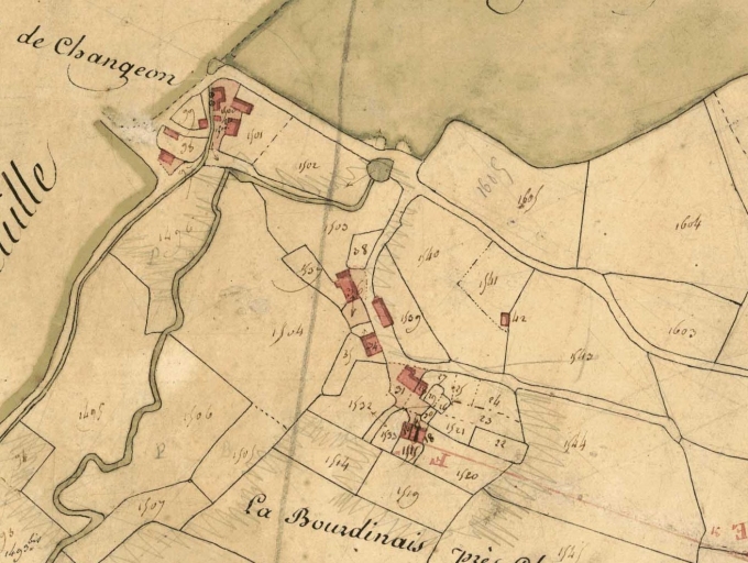 Le site du moulin en 1827 sur le cadastre napoléonien ; en haut, à gauche sur l'imageImmatriculation