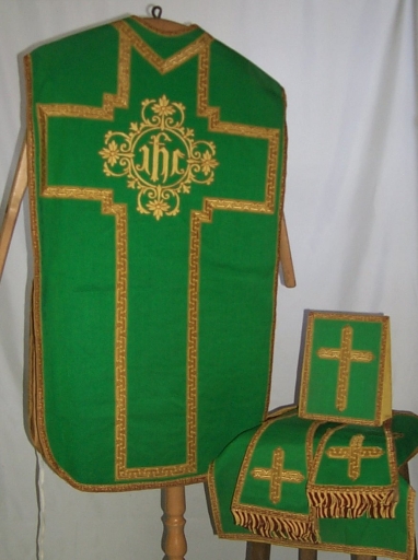 Ornement vert 2 : chasuble, bourse du corporal, étole, manipule, voile du calice,